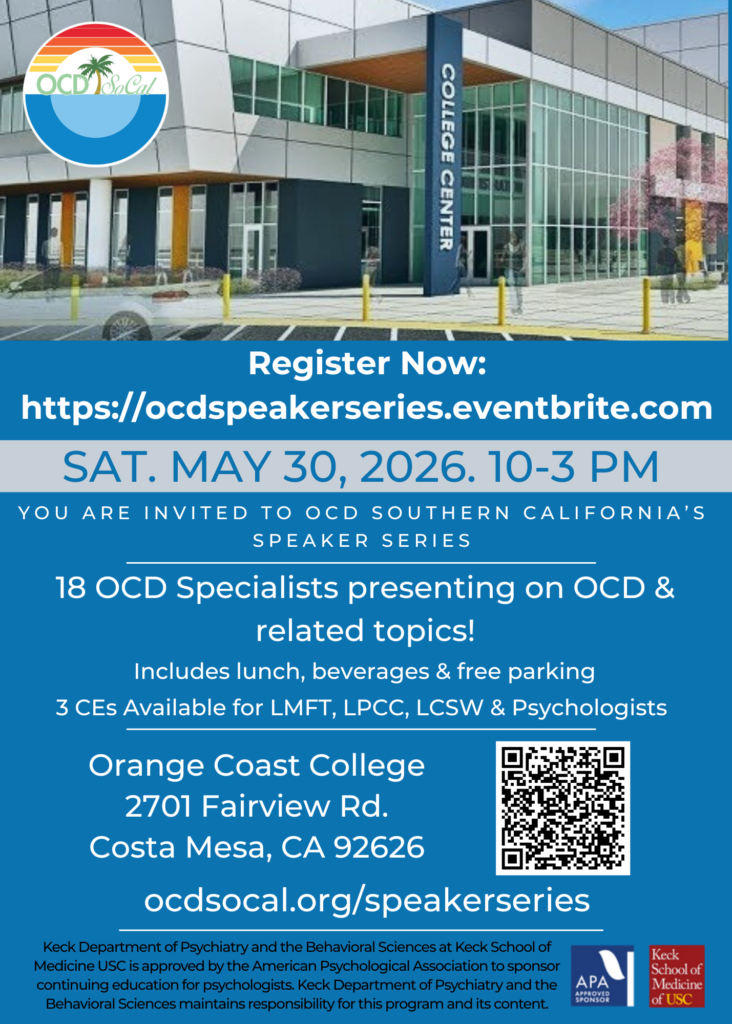 Register Today for OCD SoCal’s Saturday, May 30th, 10am – 3pm, In-Person Speaker Series! We are currently offering discounted, early-bird registration so sign up today! Register here: https://ocdspeakerseries.eventbrite.com