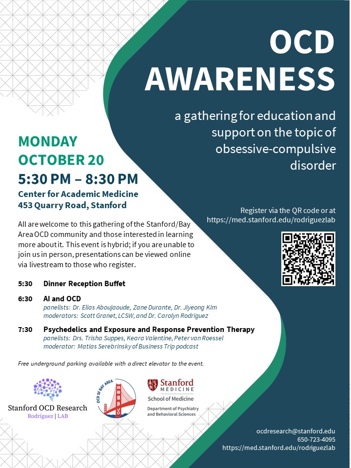 OCD Awareness Week Gathering: Dinner, Hybrid Panel Presentations, Q&A, Support, Education Monday, October 20, 5:30 – 8:30 pm Center for Academic Medicine, Grand Rounds Room 453 Quarry Rd, Stanford + livestreamed webinar, which will be recorded A hybrid gathering for education and support for those affected by obsessive-compulsive disorder and anyone interested in learning more... Read more »