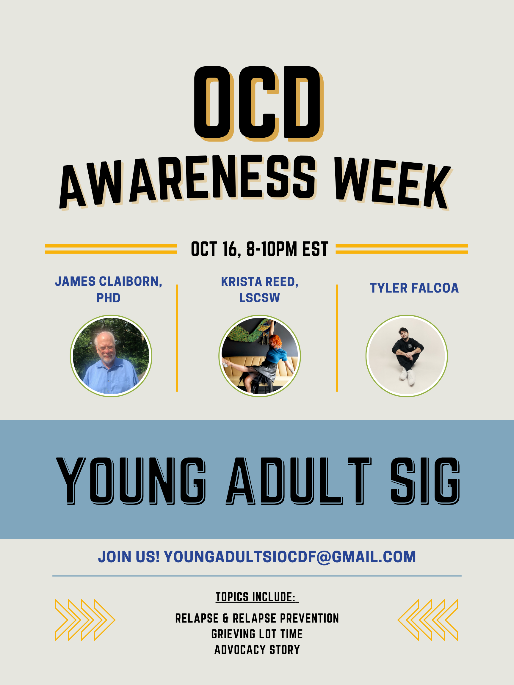 8:05-8:35pm: Relapse and Relapse Prevention, Dr. James Claiborn 8:35-9:05pm: Grieving Lost Time, Krista Reed LSCSW 9:05-9:35pm: Advocacy Story, Tyler Falcoa To receive the link and future updates for the Young Adult Special Interest Group visit https://iocdf.org/special-interest-groups/young-adults/